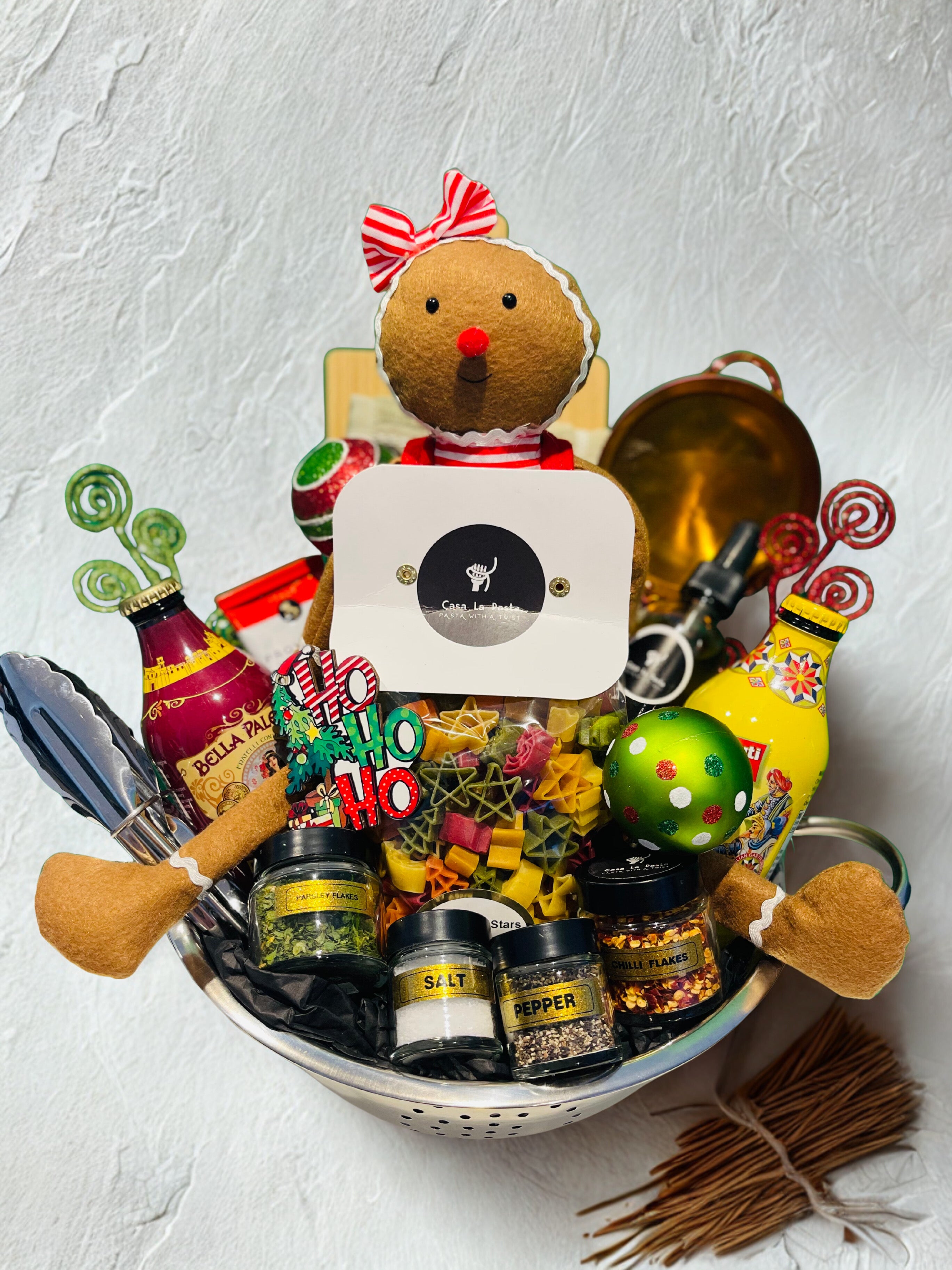 The Christmas hamper ready to cook and serve. This hamper has everything to cook a christmas lunch with christmas pasta. Hamper includes pasta sauce, herbs, spices, oil, tomato pastw and pasta accessories including the pasta strainer. Enjoy a quick and easy christmas meal.