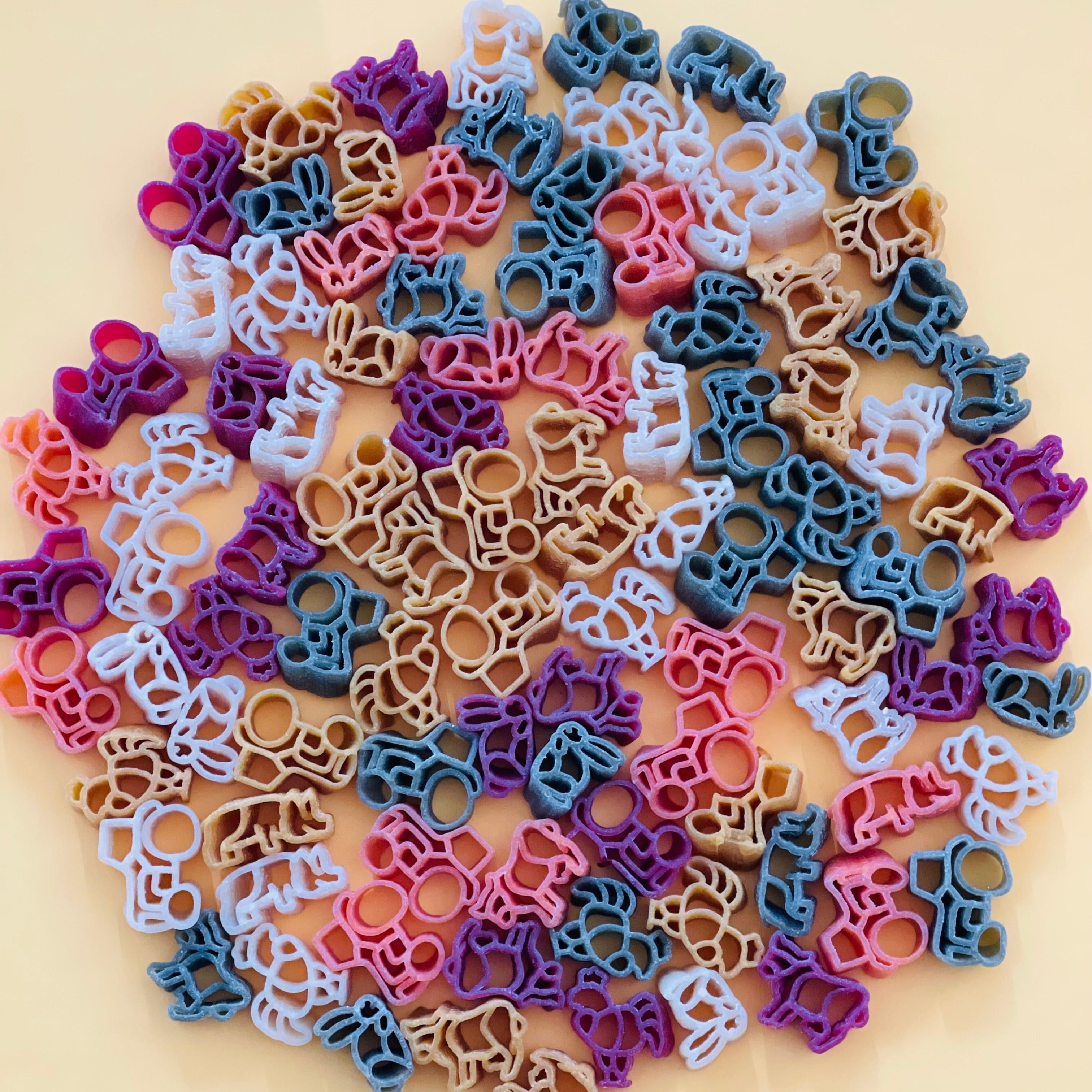 Animal Farm designed pasta in 5 different farm characters, in 5 different colours, red, orange, green, plain and yellow. Flavours include chard, tomato, spinach and turmeric.