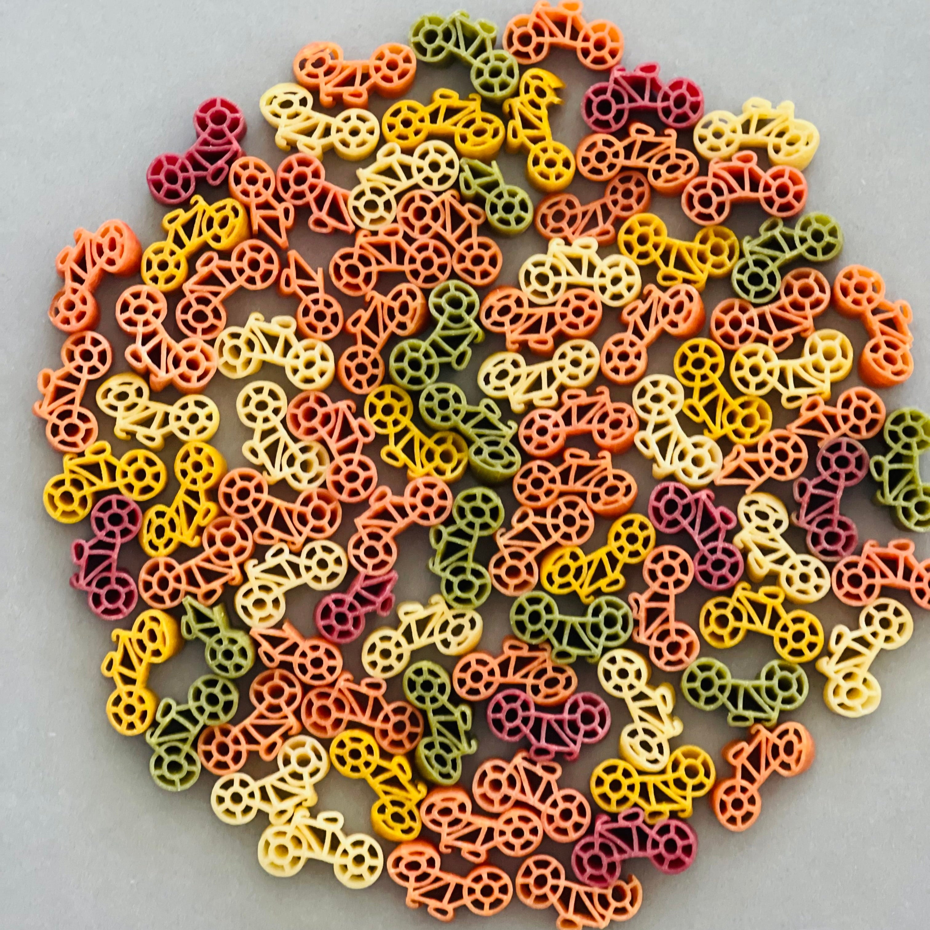 Bike designed pasta in 5 different colours, green, red, plain, yellow and orange and different flavours including, chard, tomato, spinach, turmeric. 500g bags.