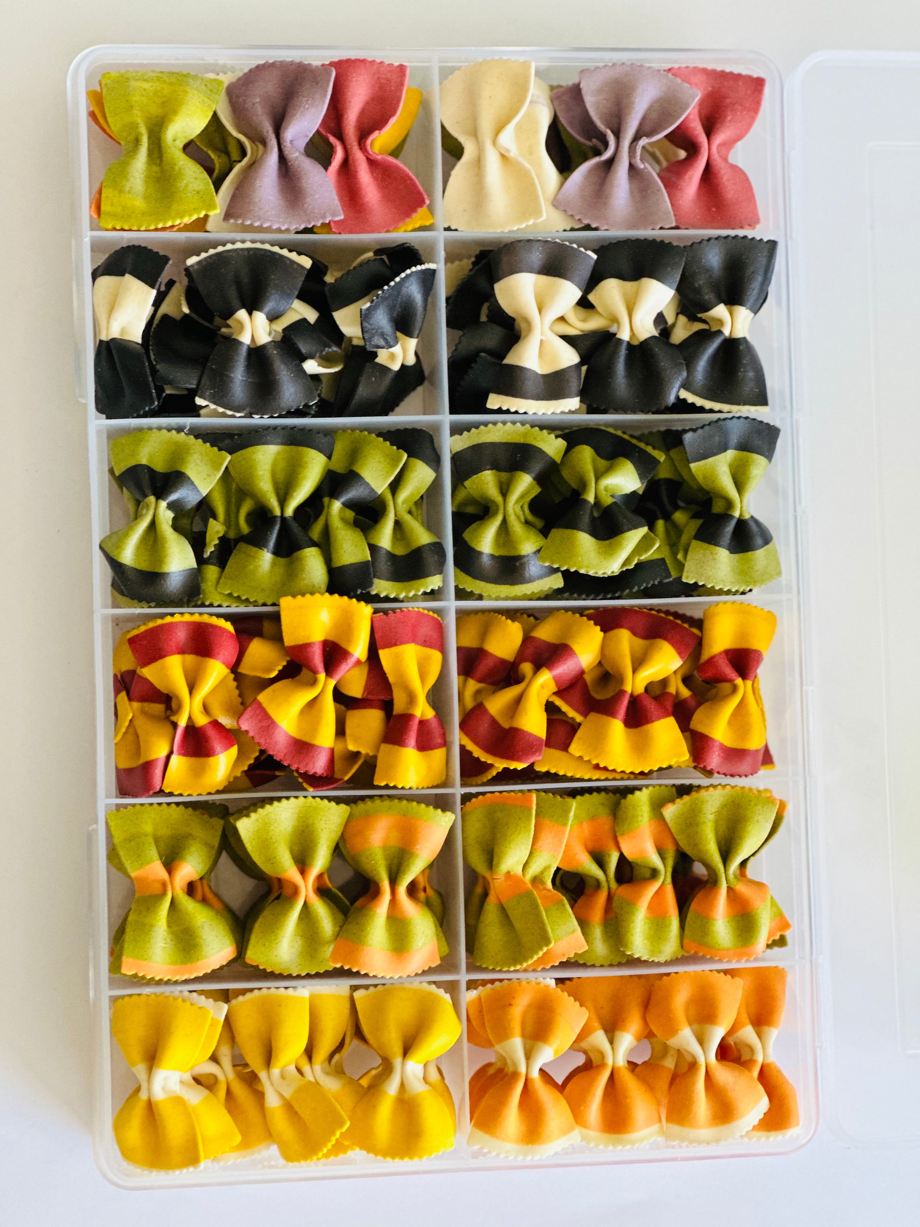 Our fun Sapori e Colori box contains 12 different fun coloured pastas. This is a mixture of our vegetable and black squid ink flavour range.